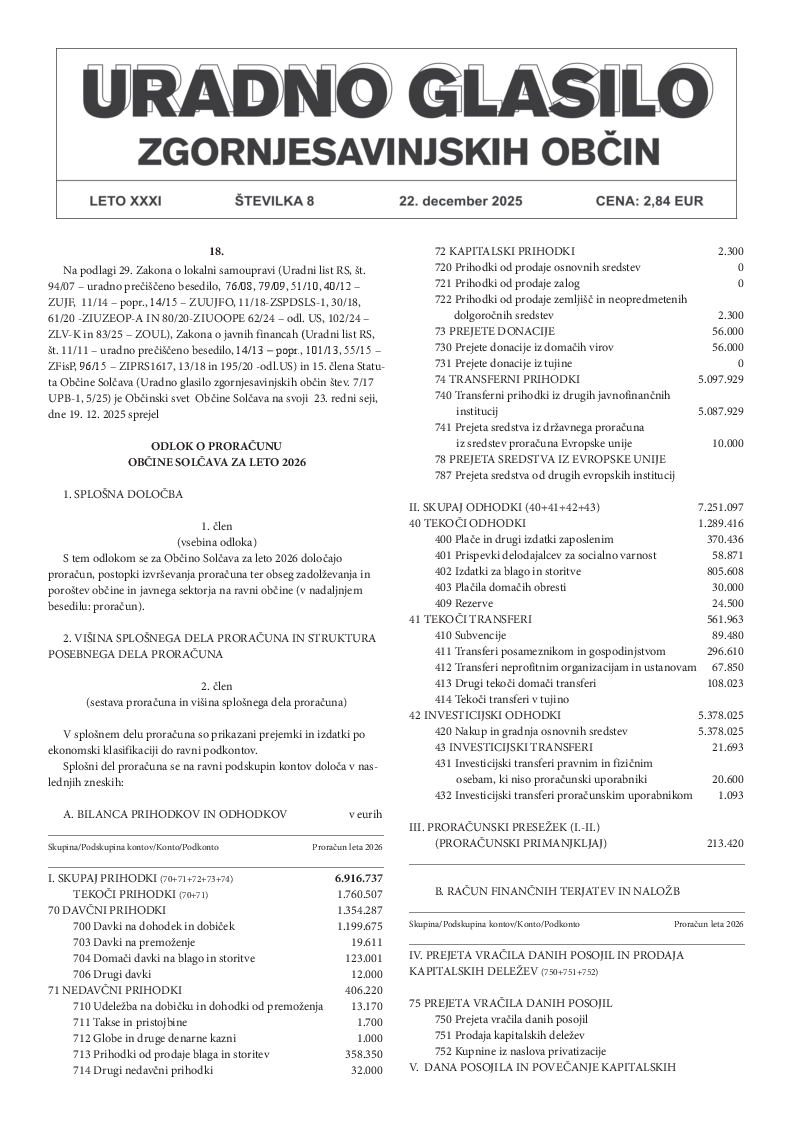 Odlok o proračunu Občine Solčava za leto 2026 (Uradno glasilo 8/2025)
