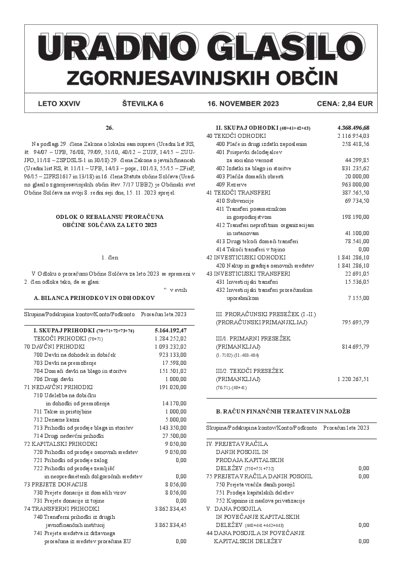 Odlok o rebalansu proračuna občine solčava za leto 2023 (Uradno glasilo 6/2023)